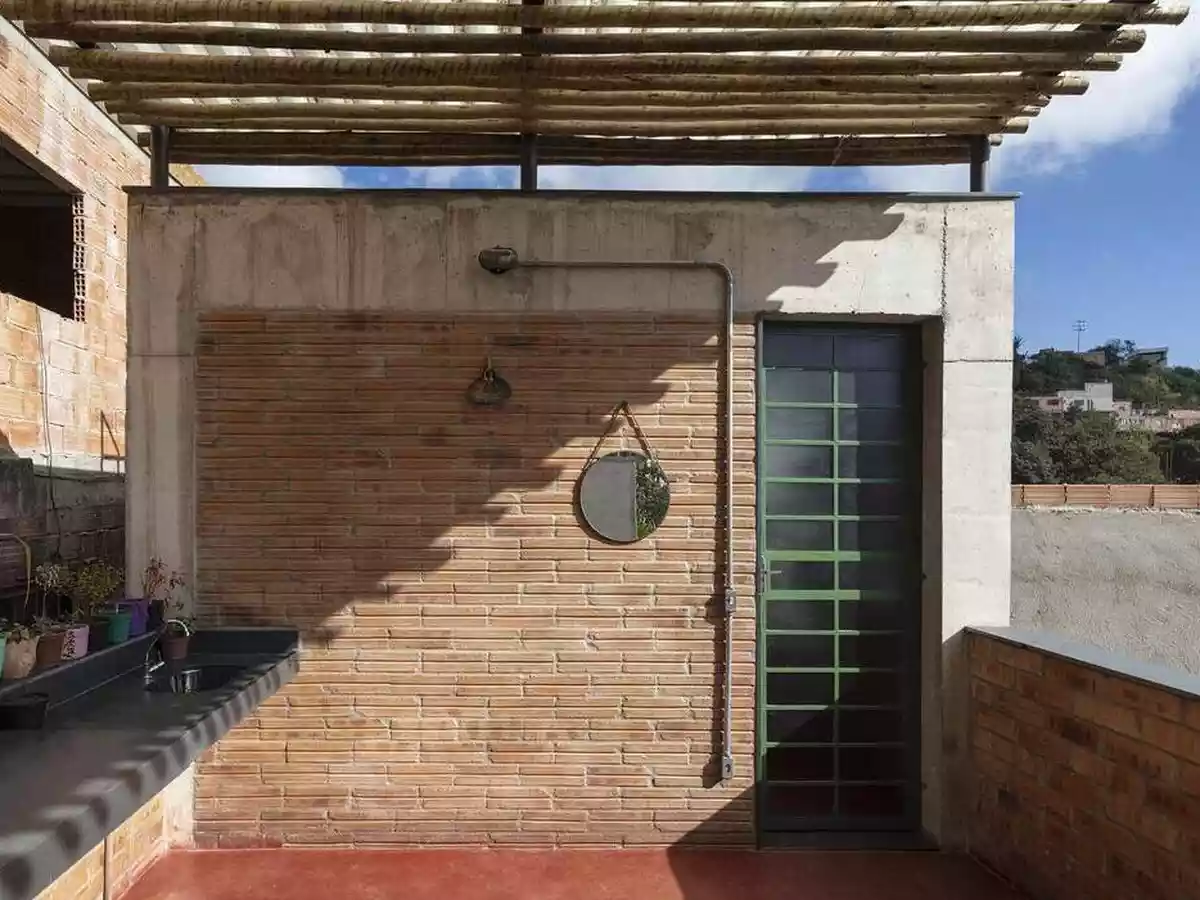 A casa teve a construção sobre tijolos de 8 furos expostos, com o uso de pisos e revestimentos, sem reboco e pintura. A ideia de fazer isso era preservar a conexão com seu entorno e a valorização das técnicas que a própria comunidade do entorno utiliza. A casa é implantada em um terreno anguloso de 70m², tendo dois blocos de 3x3m em dois níveis.