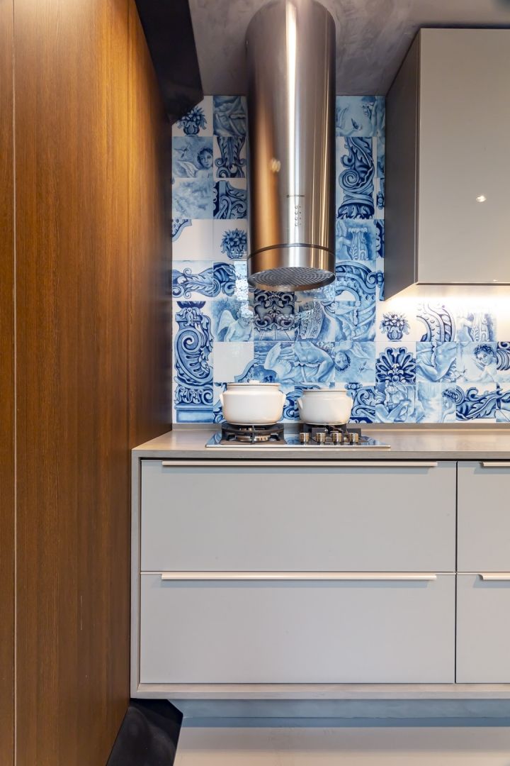 No caso das cozinhas, backsplashes vibrantes e tampos de madeira, por exemplo, adicionam contraste, enquanto detalhes em cobre ou latão podem aquecer a composição.