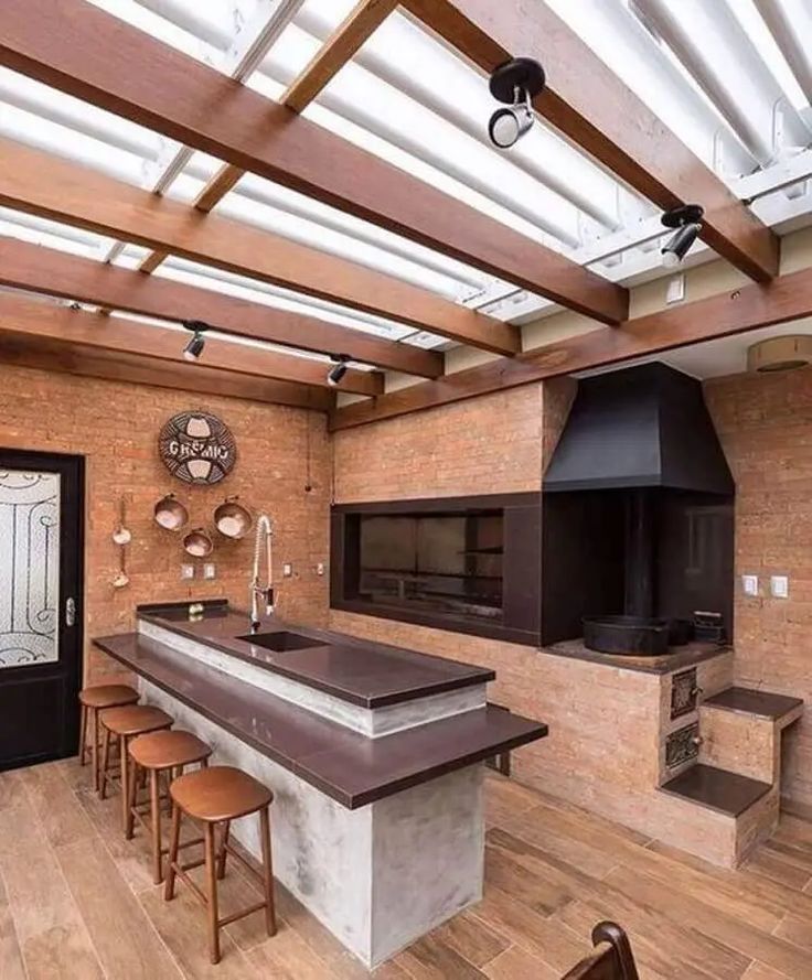 Uma área gourmet com fogão a lenha pede uma decoração que valorize a estética rústica e o aconchego.