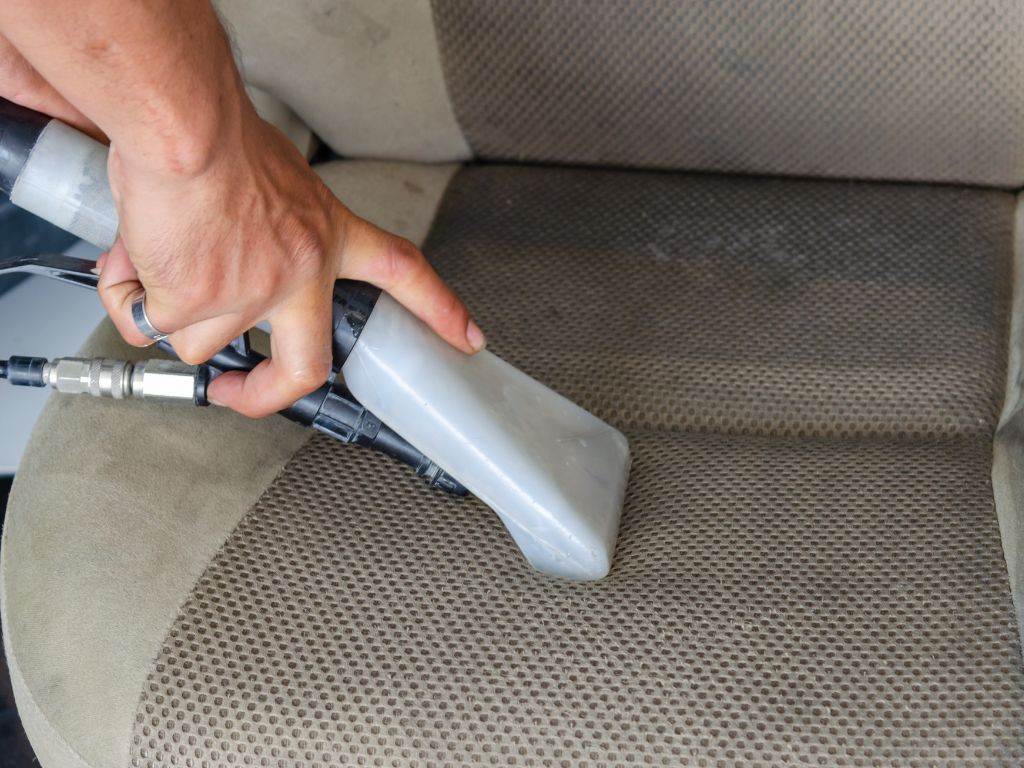 pessoa passando aspirador de pó em banco de carro