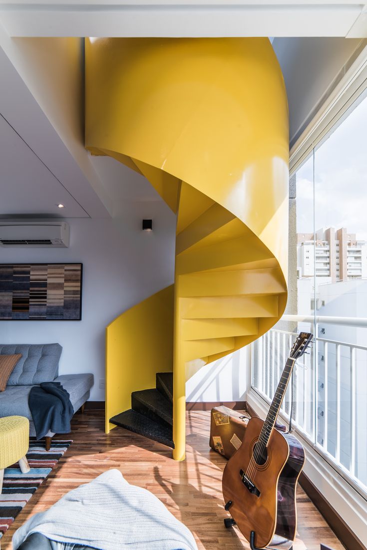 A primeira escada caracol é um exemplo vibrante e moderno, com um design totalmente amarelo que traz um toque de cor e alegria ao ambiente.