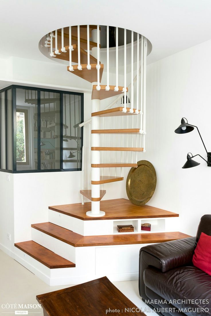 A escada caracol minimalista em madeira é uma escolha discreta.