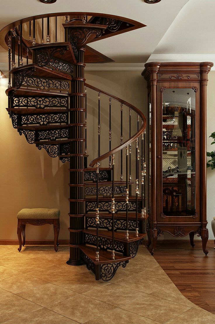 Para quem prefere um estilo mais clássico e sofisticado, a escada caracol em madeira e metal ornamentado é a escolha ideal.