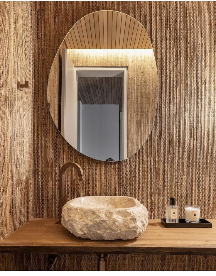 A textura e a cor natural da madeira trazem calor e aconchego ao lavabo. Além disso, entre os modelos de espelho, esse combina muito bem com um lavabo repleto de elementos naturais, como pedra ou cerâmica.