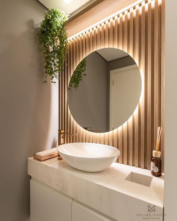 A moldura do espelho também deve harmonizar com o restante da decoração. Materiais como madeira, metal ou mesmo espelhos coloridos devem complementar os outros elementos do seu lavabo, como a pia, torneiras e revestimentos.