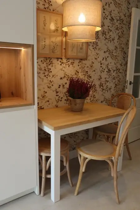 Em cozinhas pequenas, uma solução prática é substituir balcões de café da manhã pouco usados por uma mesa compacta para refeições.