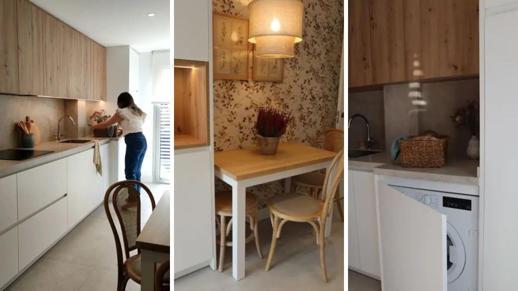Um truque que funciona bem em cozinhas pequenas é a combinação de móveis brancos com toques de madeira.