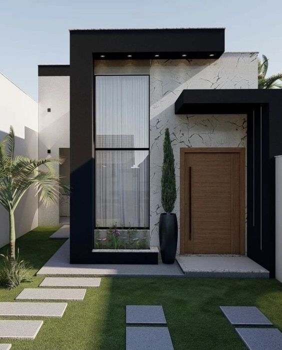 Também considere a cor da porta; cores vibrantes como vermelho ou azul podem ser um ponto de contraste interessante contra uma fachada mais neutra.