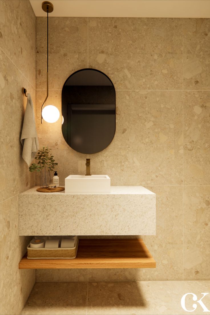 O banheiro é outro ambiente onde esse material pode brilhar. Utilizá-lo como revestimento das paredes e pisos proporciona um aspecto sofisticado e atemporal ao espaço.