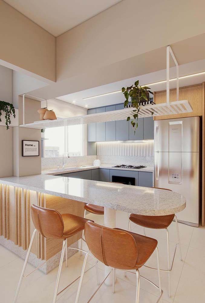 A cor clara do Branco Itaúnas ajuda a criar uma sensação de amplitude e luminosidade, essencial em cozinhas menores e a uniformidade da superfície do granito garante um espaço higiênico, perfeito para o manuseio de alimentos.