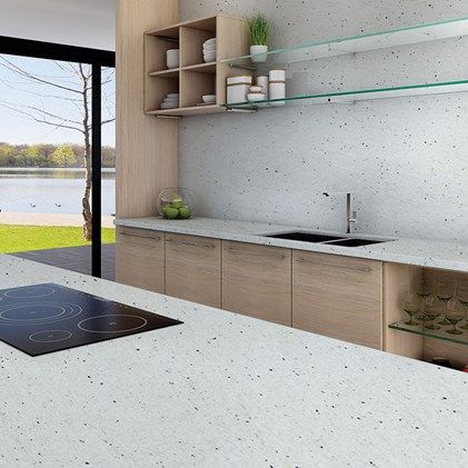 A superfície clara com detalhes pretos harmoniza bem com eletrodomésticos em inox e armários brancos ou em tons de madeira clara, criando um ambiente clean e moderno.