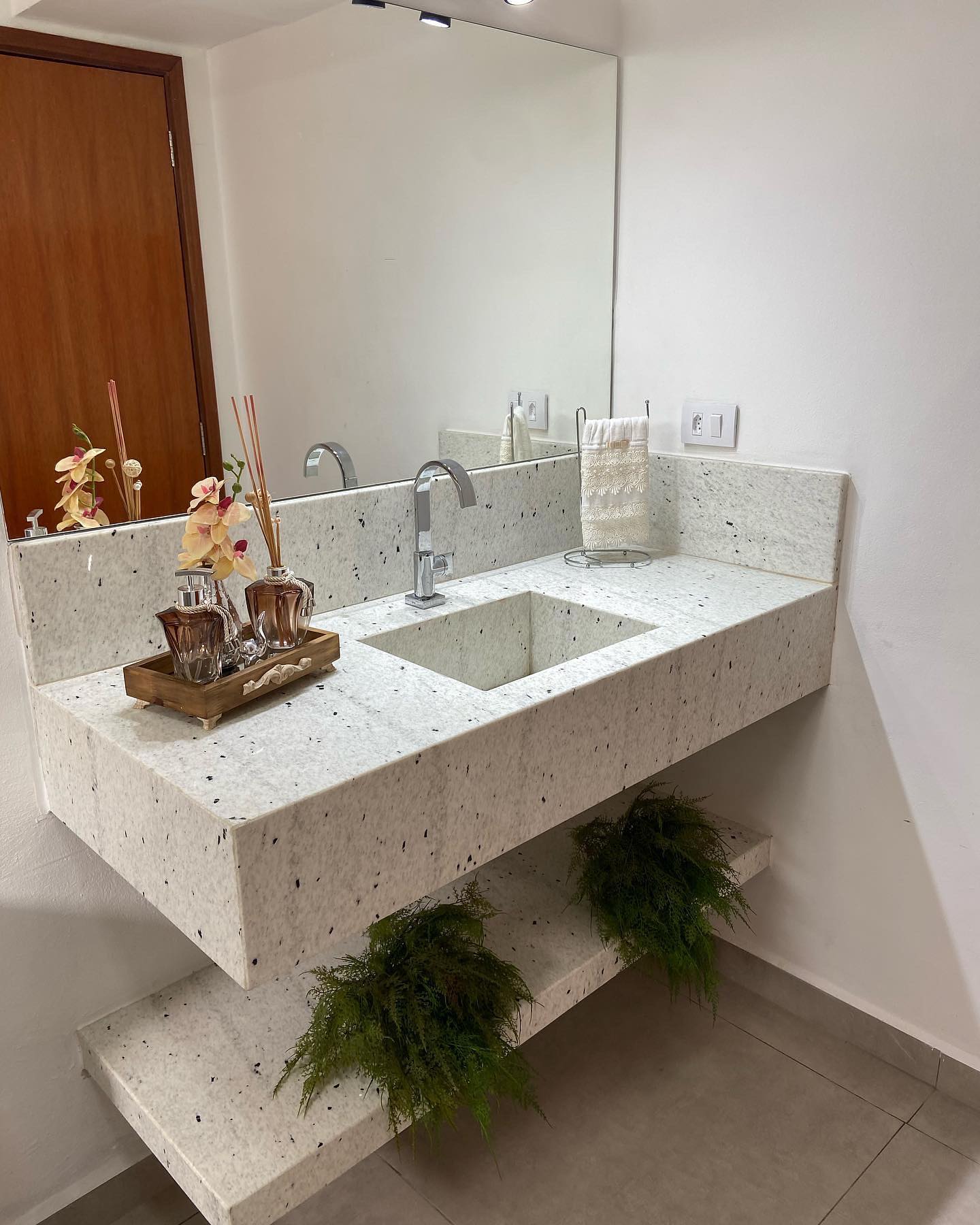 Em banheiros com espaço limitado, a cor clara do granito ajuda a ampliar visualmente o cômodo, enquanto as manchas pretas adicionam textura, deixando tudo mais elegante.