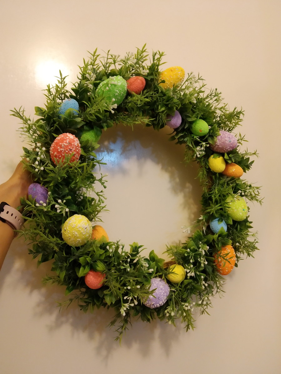 Finalize a guirlanda de Páscoa usando elementos decorativos que remetam a essa data, de modo a garantir uma peça criativa para seu lar.