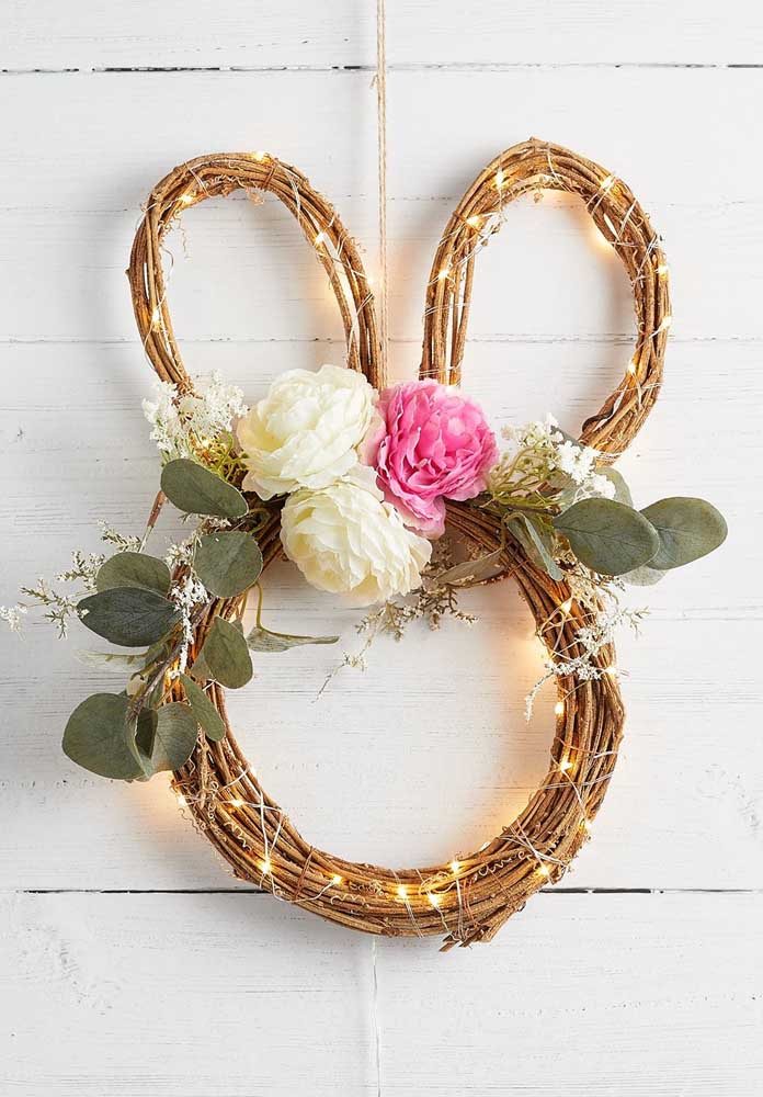 Seu tradicional pisca-pisca de Natal pode ser reaproveitado na guirlanda de Páscoa, para torná-la ainda mais festiva. Enrole as luzes ao redor do acessório, distribuindo-as de forma igual.