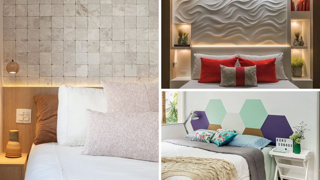 Substituir a cabeceira tradicional por painéis esculturais é uma forma de transformar a parede em peça central do ambiente.
