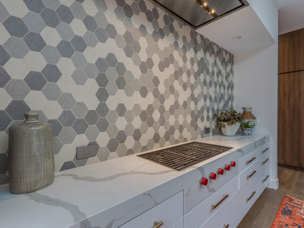 Para quem prefere uma cozinha com visual minimalista e sofisticado, os azulejos em formato hexagonal, combinando tons neutros como cinza e bege, são uma excelente escolha.