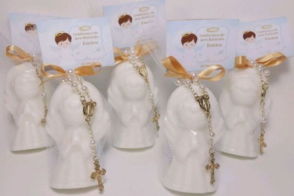 Você pode escolher sabonetes com formatos temáticos, como anjinhos ou pombinhas, e adicionar essências suaves para uma experiência sensorial agradável.