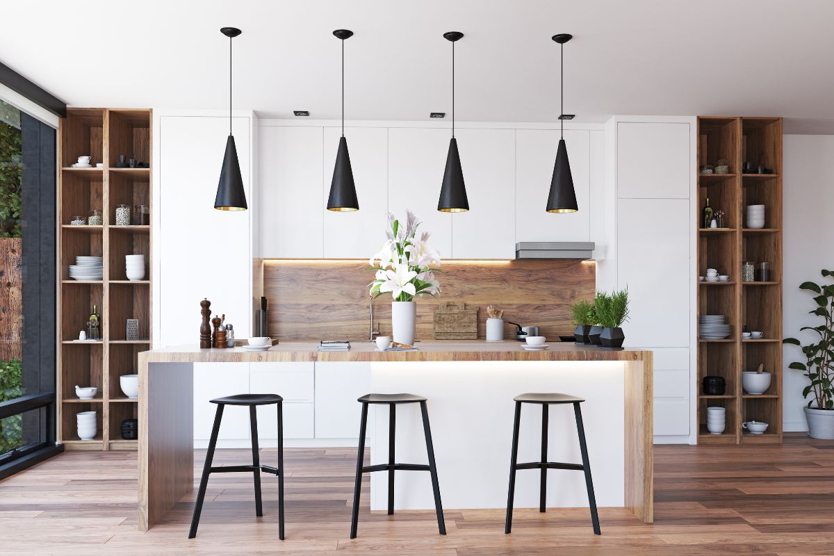 Ilhas de cozinha promovem um ambiente mais prático e funcional, sendo perfeitas para refeições rápidas ou espaços de buffet. Pendurar luminárias sobre esse espaço, embora comum, é algo que muitos arquitetos evitam.