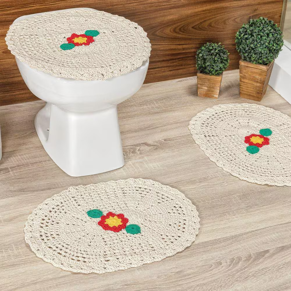 O jogo de banheiro de crochê é composto por três peças principais: tapete de crochê, porta papel higiênico e capa para a tampa do vaso sanitário. Essas peças são geralmente feitas à mão, utilizando fios de algodão ou linhas especiais para crochê, o que confere um alto nível de detalhes e acabamento.