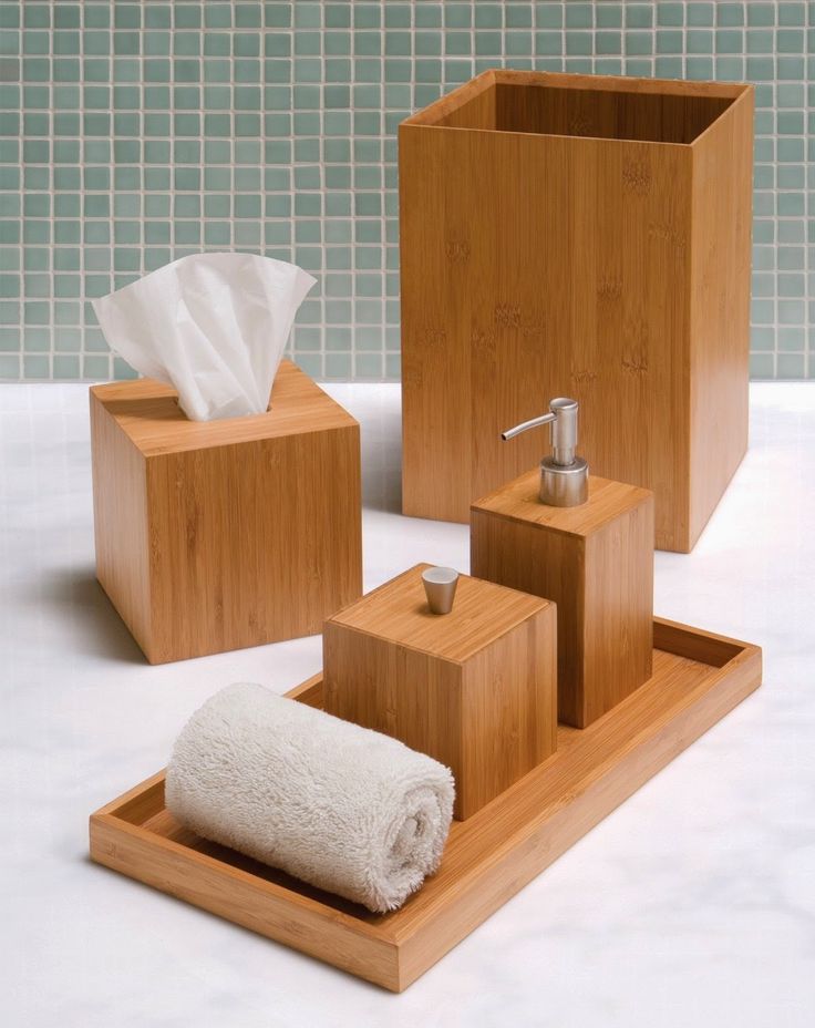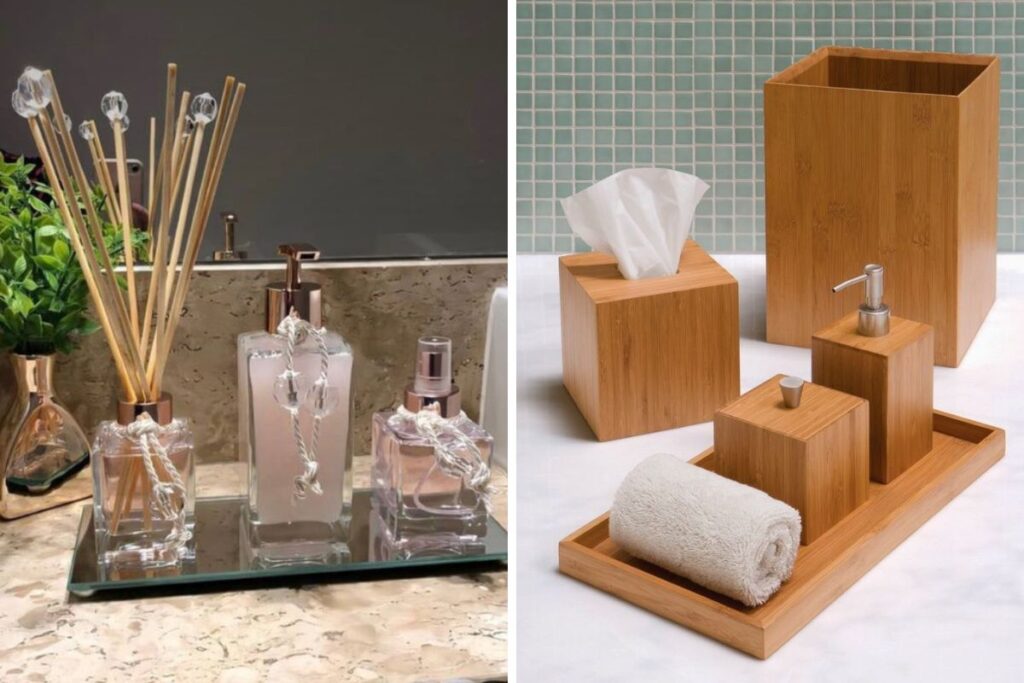 Os kits de bambu trazem um toque rustico e aconchegante ao banheiro. São ideais para decorações que valorizam elementos naturais.