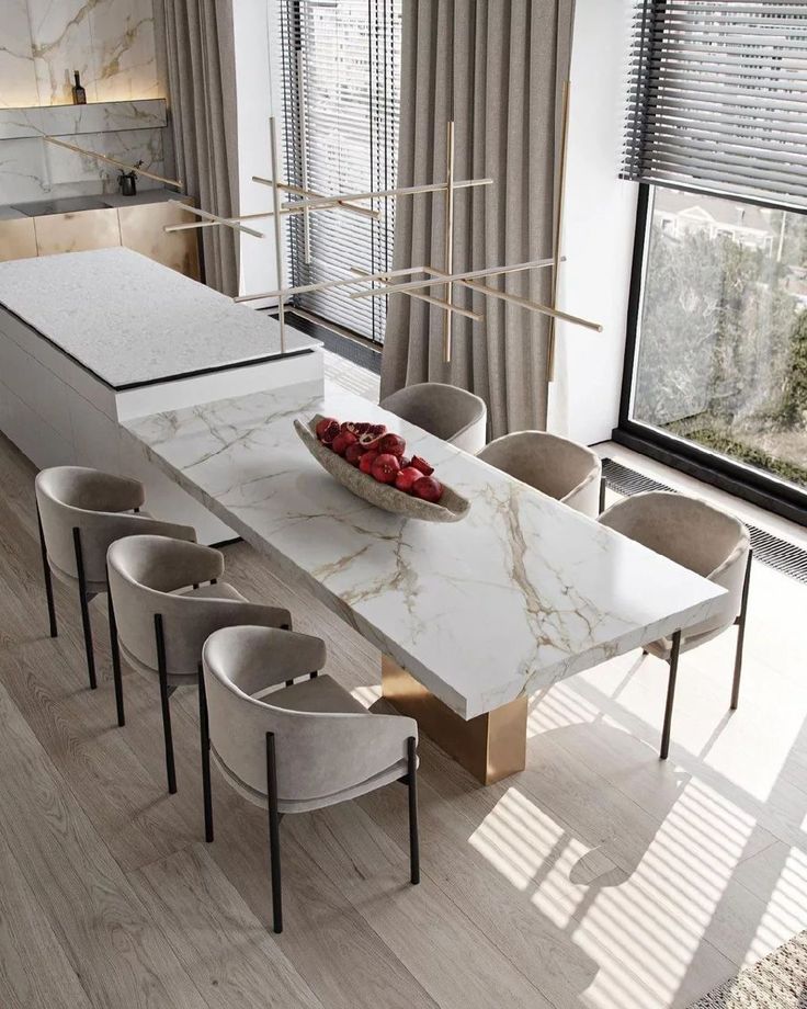 Uma mesa de jantar revestida com mármore Carrara, é o toque de elegância que qualquer sala de jantar precisa..