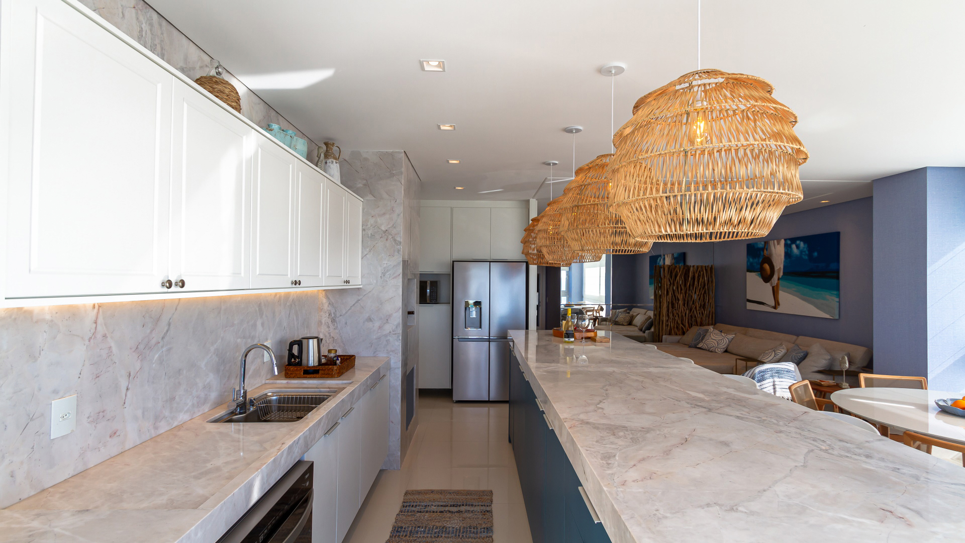 Também dá para usá-lo em bancadas e ilhas centrais, sempre conferindo suavidade e sofisticação para a decoração do local.