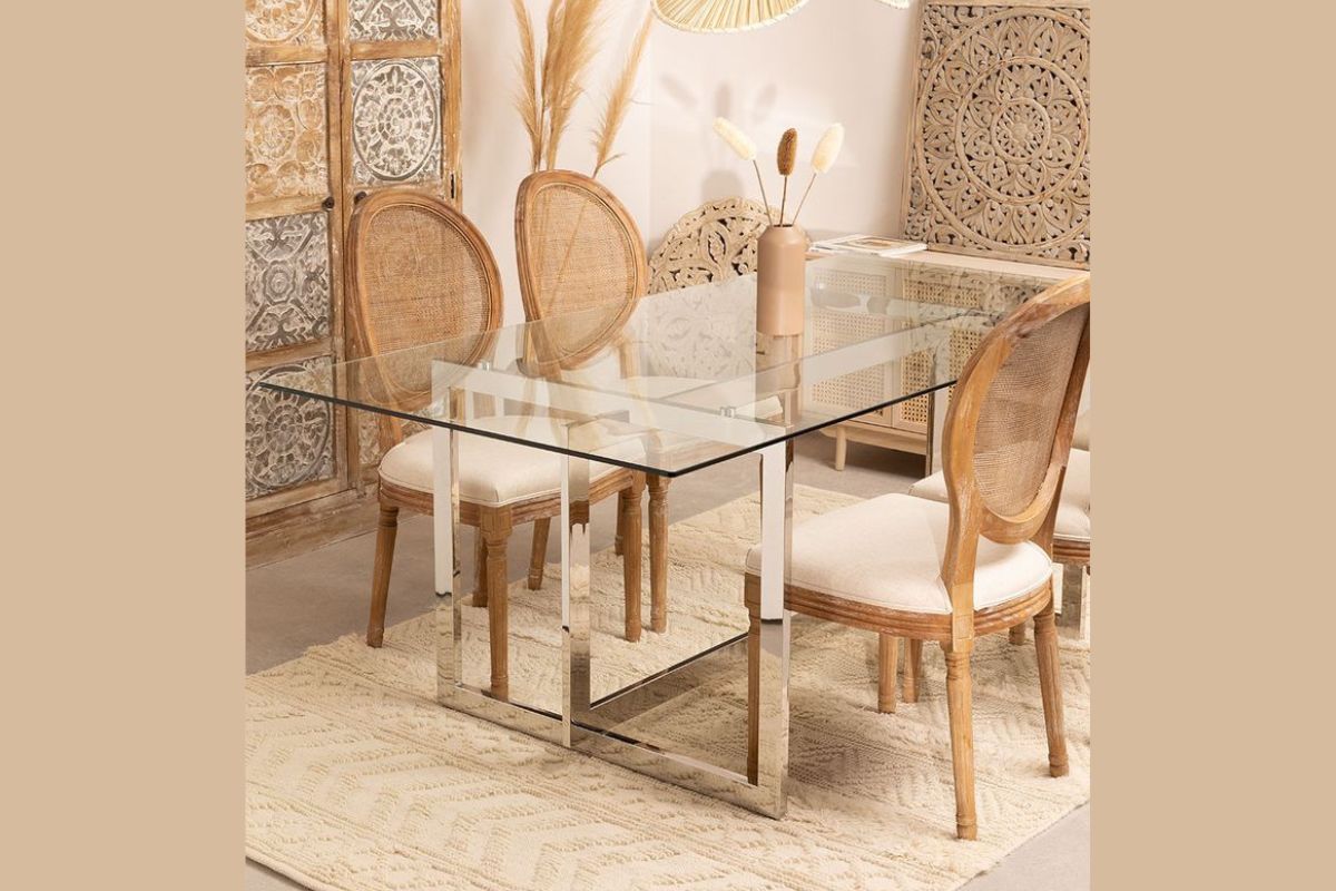 O vidro cria uma sensação de espaço e permite que a luz flua livremente, tornando a sala de jantar mais luminosa. Combinado com cadeiras de palha, esse conjunto evoca uma sensação de casualidade e conforto. É perfeito para espaços mais informais e ensolarados, como cozinhas integradas ou varandas.