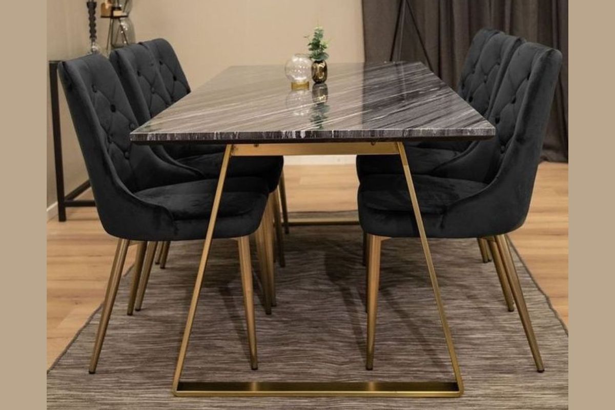 A combinação de um tampo de mesa em granito escuro e uma base industrial é a escolha perfeita para quem busca uma estética contemporânea e sofisticada em 2024.