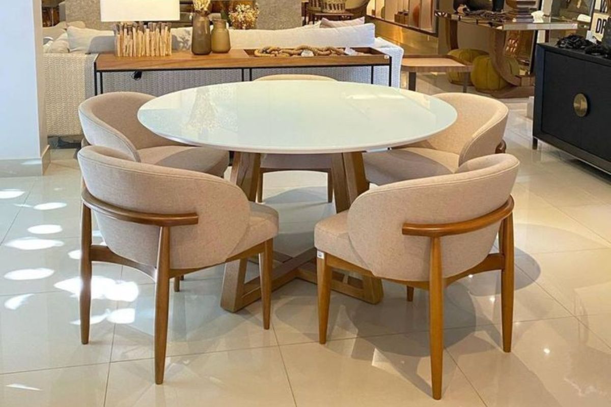 A tendência das mesas redondas com cadeiras de madeira natural é uma resposta ao desejo crescente de conexão com a natureza e simplicidade na decoração de interiores em 2024.