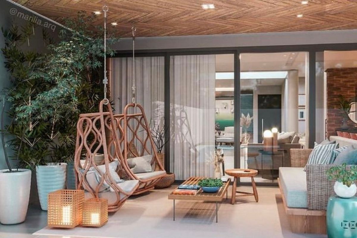 Para um toque de descontração e originalidade, considere adicionar uma ou duas cadeiras suspensas. Além de serem extremamente confortáveis, elas servem como um ponto de estilo na decoração da varanda.