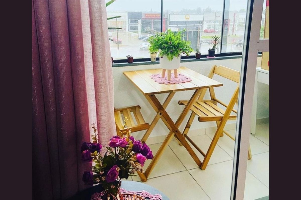Para varandas menores, os móveis dobráveis de madeira oferecem flexibilidade e praticidade.