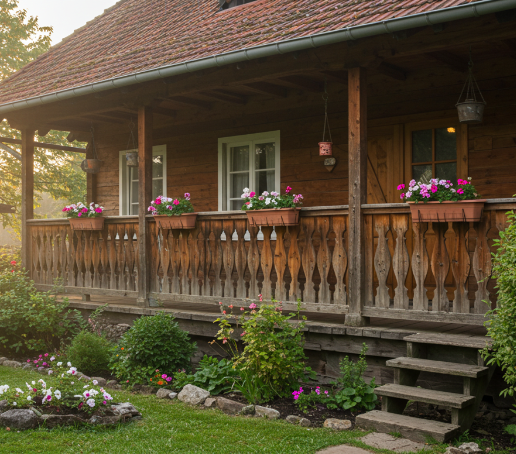 Uma varanda rústica, por outro lado, também pode adicionar um charme acolhedor à frente de casa.