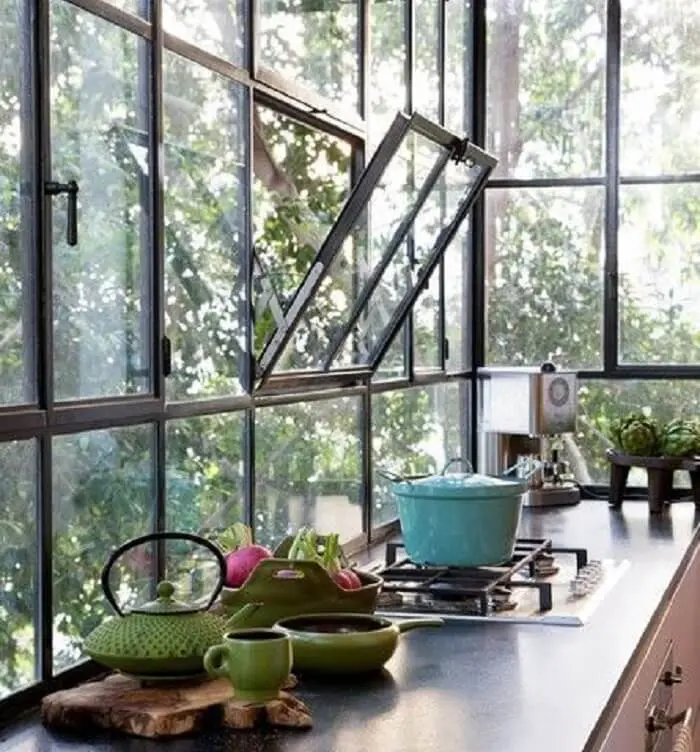 Este tipo de janela proporciona uma boa visibilidade da área externa, por isso é ideal para cozinhas voltadas para jardins ou vistas bonitas da região.