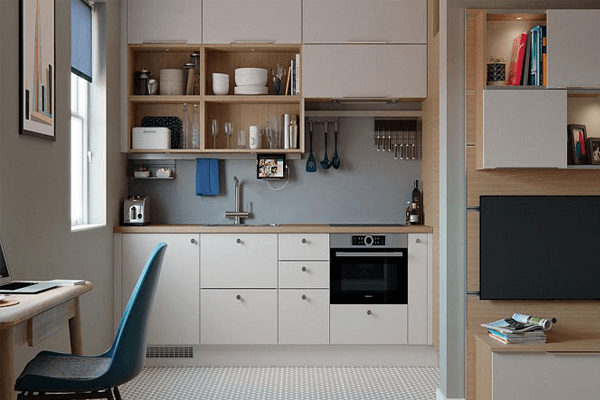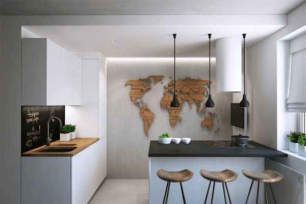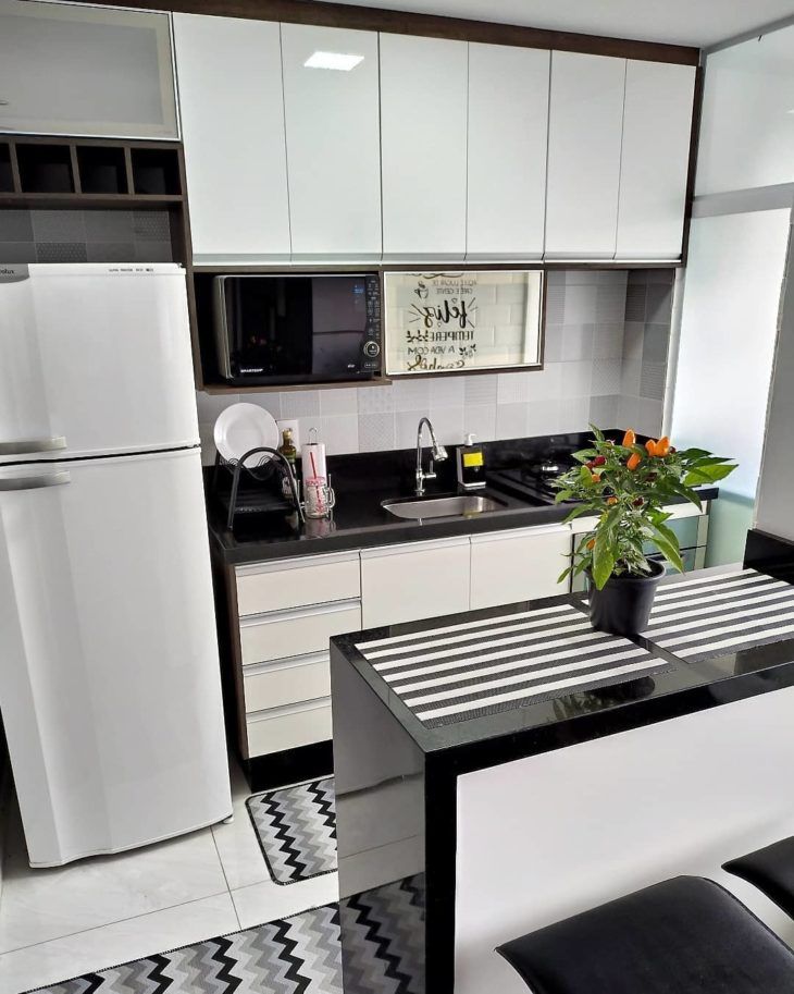 Essa modalidade é uma das que tem mais crescido quando o assunto se trata de design de interiores e arquitetura de interiores. Veja como fica bonito numa foto mais ampla de uma cozinha pequena: