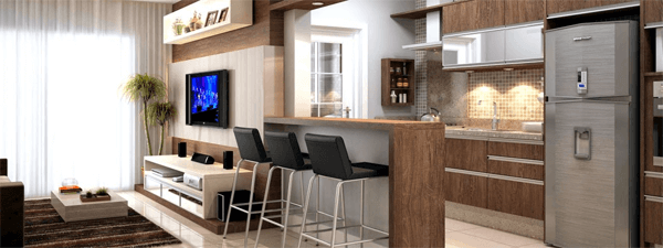 Quando falamos de um apartamento pequeno, é preciso investir em uma decoração para otimizar espaço, seja junto com a sala de jantar, investindo em uma cozinha planejada no apartamento.
