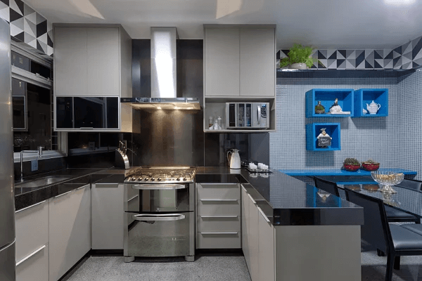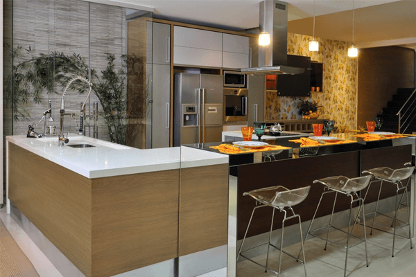 Dependendo de como é articulação do ambiente ainda é possível criar ilhas, deixando um pedaço de bancada para cozinhar, a pia e o fogão no mesmo lugar.