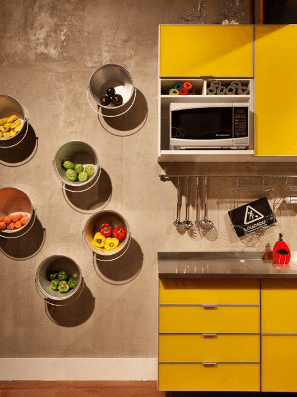 Lugar para guardar frutas é algo que pode faltar na cozinha. E – acredite- nem todas elas devem ser guardadas na geladeira. Por isso, você pode aproveitar algum espaço na parede disponível para pendurar uma estante, desde que fique bem à mão.