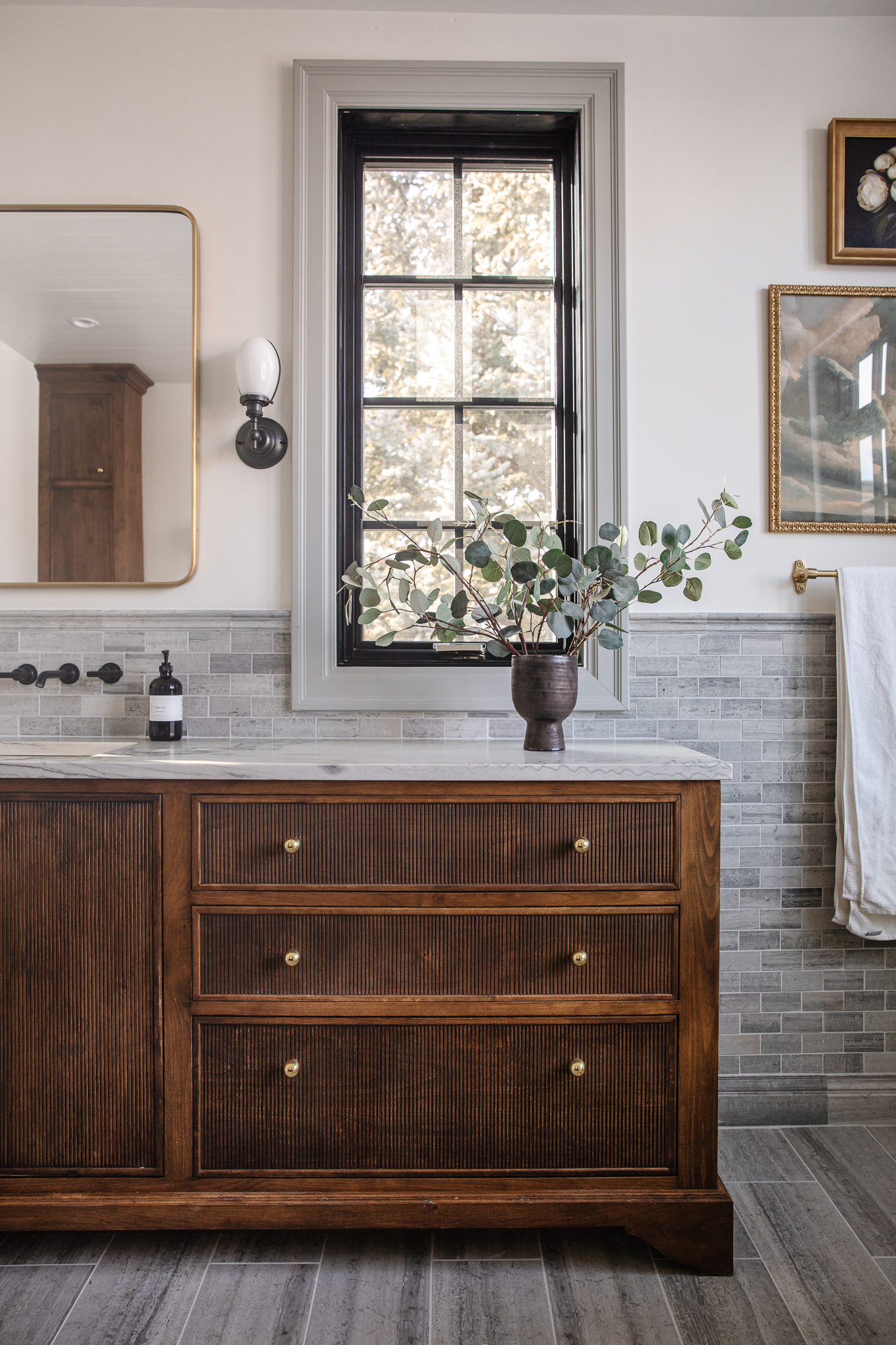 O acabamento de madeira, que pode estar presente somente nas laterais ou nas bordas frontais dos móveis, tem tudo para dar um toque final e, só com isso, fazer a aparência do banheiro fugir do comum.