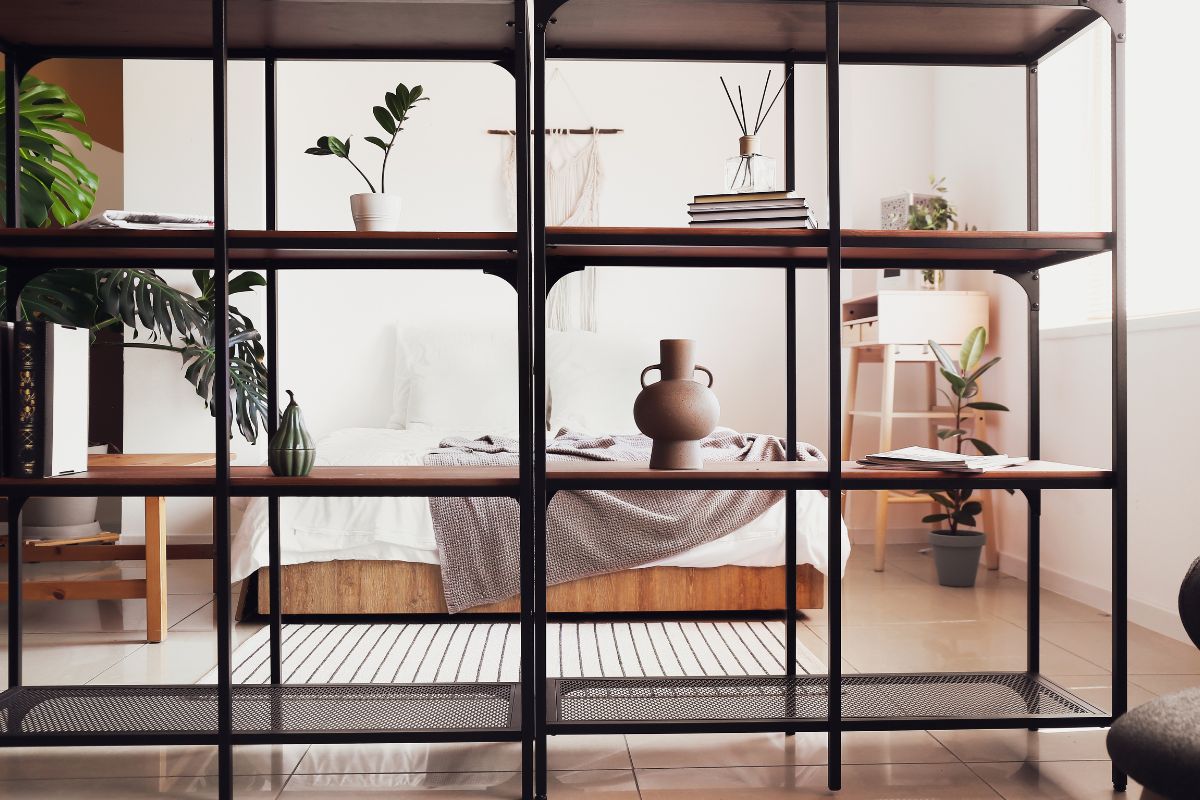 Em casas com ambientes integrados, as estantes como divisórias são uma solução criativa e funcional.