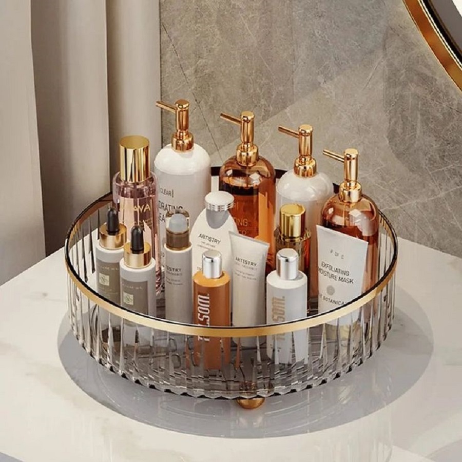 Elementos simples, como bandejas decorativas, são ideais para organizar itens como perfumes e cremes. Elas trazem elegância e evitam bagunça na pia.