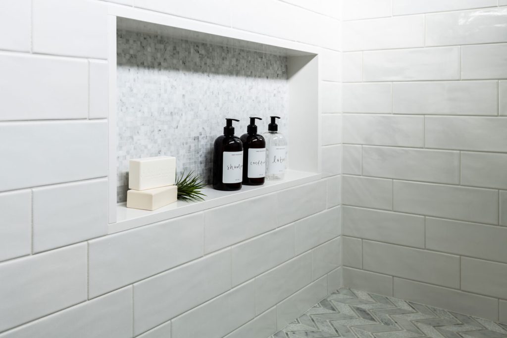 Os nichos no banheiro são como pequenos refúgios para os seus itens essenciais.