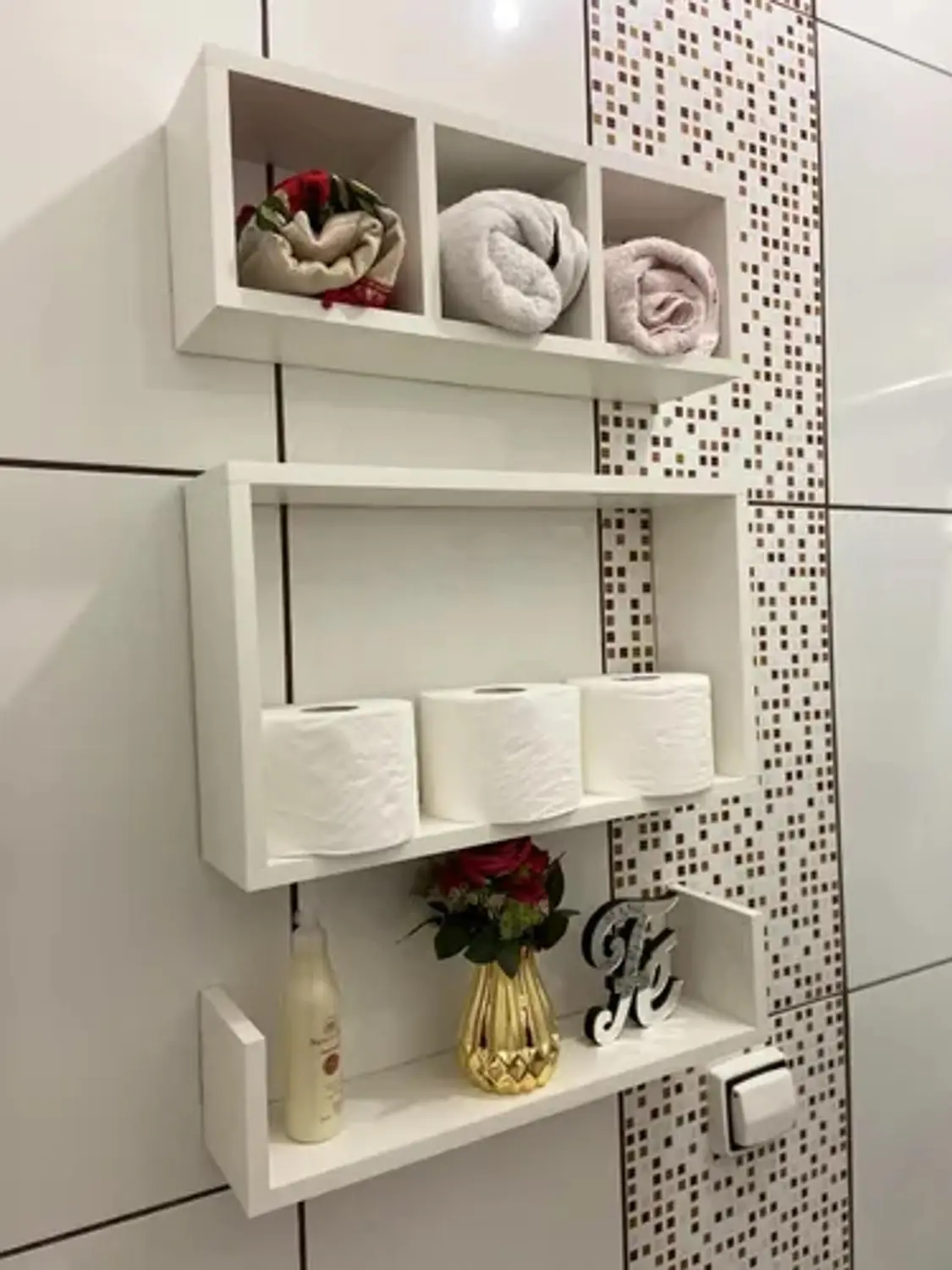 Também dá para usar nichos embutidos na parede, e você também tem a opção de colocar acima do vaso sanitário, onde esses elementos ficam muito bem.