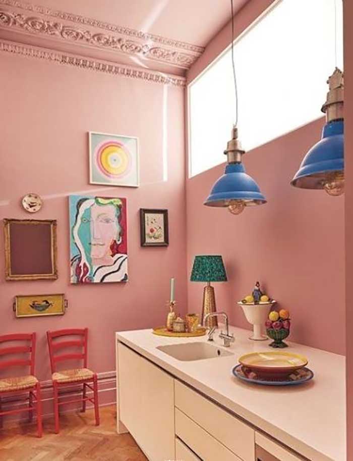 - Paredes Rosa: A cor rosa voltou e com força total. Mas não estamos falando apenas para locais de crianças. O rosa-pálido está sendo usado nas paredes das salas de estar, cozinhas e até banheiros.