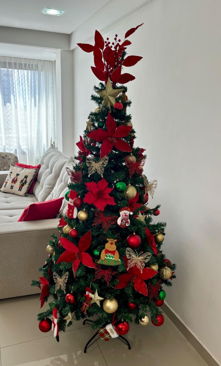 A árvore de Natal, claro, continua sendo o grande destaque. Para evitar que ela fique exagerada, uma boa estratégia é combinar enfeites metálicos com detalhes naturais, como pinhas ou galhos secos.