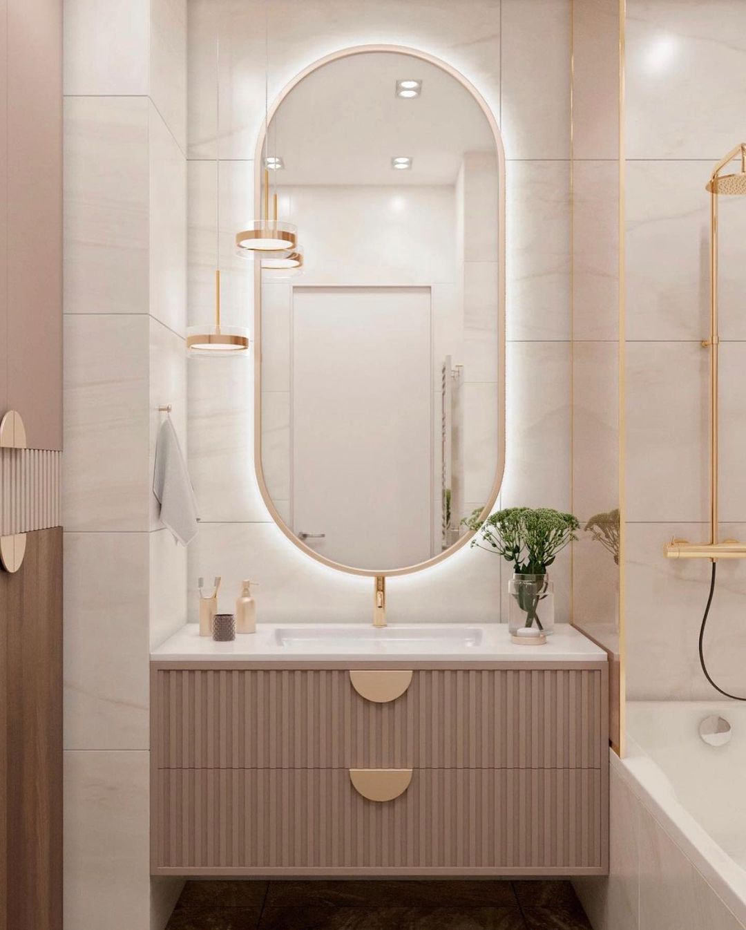 Ao escolher o espelho ideal, prefira os com tamanho grande. Também dá para instalá-lo na parede inteira ou metade dela, logo acima de bancadas ou pias.