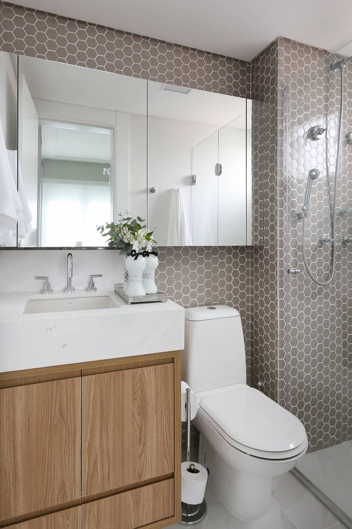 O revestimento do piso também faz a diferença! O ideal é que seja liso, sem estampas, o que ajudará a passar uma imagem de banheiro amplo e mais elegante.