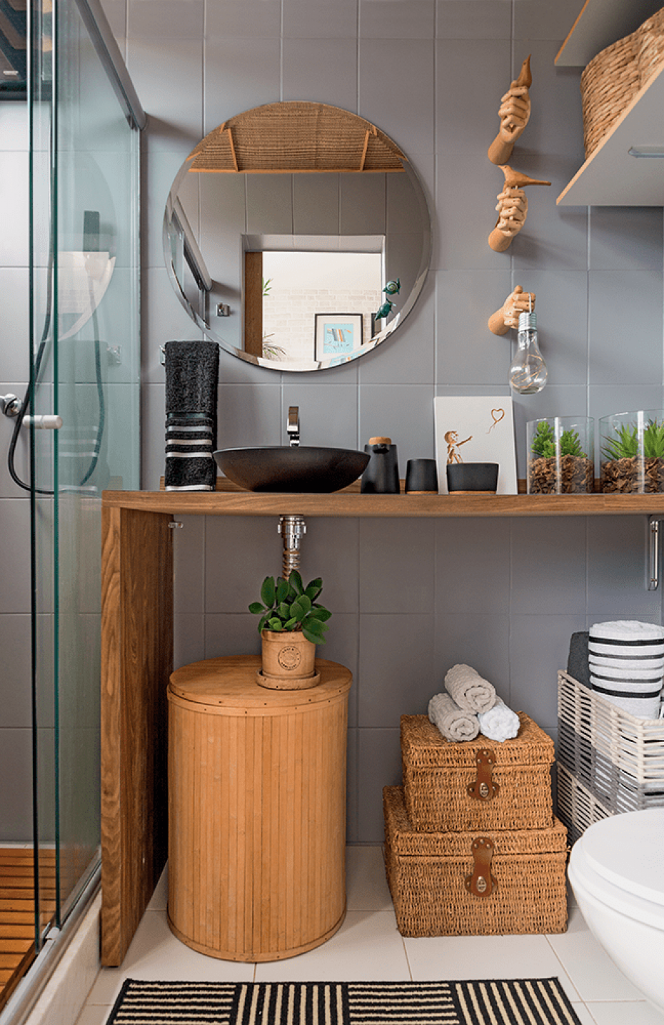 O espaço vertical também é um aliado! Ele possibilita apoiar itens e produtos em paredes, ampliando a possibilidade de uso e de organização do banheiro.