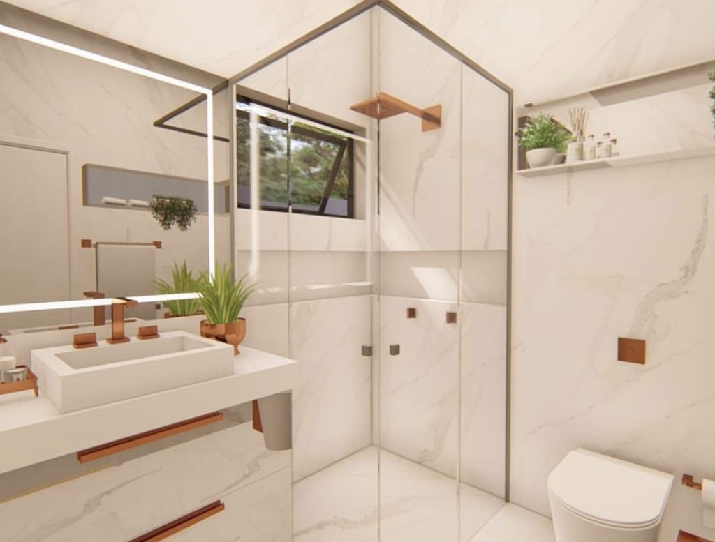 Quanto mais iluminada for a área, melhor. Para conseguir esse resultado, recomenda-se o uso de luz branca, que garante um ambiente visualmente mais amplo e a luminosidade adequada para o banheiro.