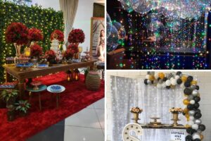Para eventos noturnos, a utilização de luzes indiretas ou cordões de LED, por exemplo, pode adicionar um brilho aconchegante, destacando as características únicas do painel.