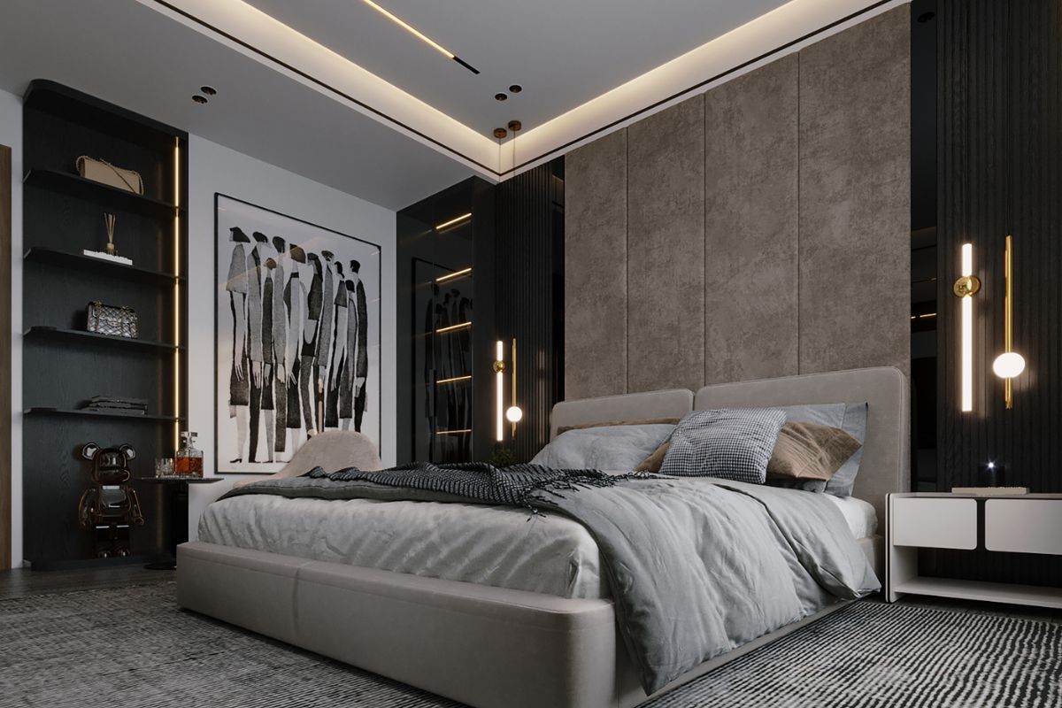 Essa abordagem confere uma elegância discreta ao quarto, permitindo que os móveis de design se destaquem. Para complementar, use acessórios em metais polidos para um toque final de sofisticação.